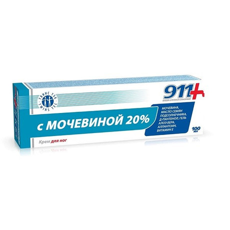 911 КРЕМ ДЛЯ НОГ С МОЧЕВИНОЙ 20% - товарного знака «911 Ваша служба спасения» Мочевина обладает увлажняющим и размягчающим ороговевшие слои эпидермиса свойствами. Крем эффективно смягчает кожу стоп, оказывает длительное увлажняющее действие, успокаивает кожу, способствует регенерации, предотвращает появление натоптышей и трещин. Д-пантенол в сочетании с гелем алое вера, аллантоином и витамином Е увлажняет, питает, успокаивает, восстанавливает мягкость и эластичность кожи.