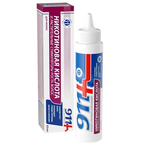 911 НИКОТИНОВАЯ КИСЛОТА И РАСТИТЕЛЬНЫЕ СТИМУЛЯТОРЫ РОСТА ДЛЯ ВОЛОС - косметическое средство для укрепления и стимуляции роста волос. При нанесении на кожу головы никотиновая кислота (витамин В3) усиливает кровообращение, улучшает транспортировку кислорода и полезных микроэлементов, ускоряет в тканях процессы обмена веществ, что препятствует выпадению волос и стимулирует их ускоренный рост. Никотиновая кислота в сочетании с активным растительным комплексом (экстракты листа березы, листа крапивы, ромашки, золотого проса, хны, хвоща, хмеля, лопуха, шалфея, зеленого чая, гель алоэ вера) защищает кожу и волосы от вредного воздействия внешних факторов, борется с облысением, волосы становятся гуще, приобретают блеск и шелковистость.