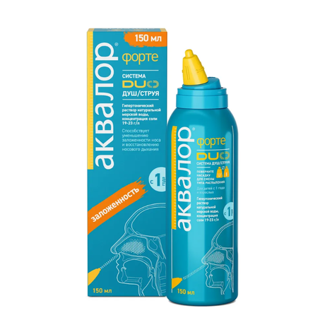 АКВАЛОР ФОРТЕ /С ПОВОРОТНОЙ НАСАДКОЙ - медицинское изделие - средство для орошения и промывания полости носа для детей и взрослых поТУ 32.50.50-010-00480081-2017. Аквалор форте представляет собой аэрозоль в алюминиевом баллоне под давлением c полиэтиленовой поворотной анатомической насадкой для носа, создающей распыление «душ / струя», с ограничительным кольцом и с полипропиленовым колпачком.