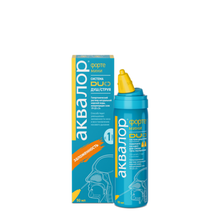 АКВАЛОР ФОРТЕ МИНИ /С ПОВОРОТНОЙ НАСАДКОЙ - медицинское изделие - средство для орошения и промывания полости носа для детей и взрослых поТУ 32.50.50-010-00480081-2017. Аквалор форте представляет собой аэрозоль в алюминиевом баллоне под давлением c полиэтиленовой поворотной анатомической насадкой для носа, создающей распыление «душ / струя», с ограничительным кольцом и с полипропиленовым колпачком. Инновационная поворотная насадка позволяет выбрать требуемый тип распыления «душ» или «струя». Описание содержимого изделия: прозрачная бесцветная жидкость без запаха