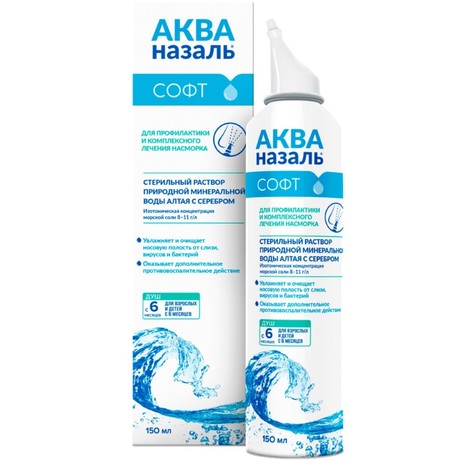 Средство для орошения и промывания полости носа «АКВАНАЗАЛЬ® Форте» - 150 мл, с гипертонической концентрацией NaCl. Средство для орошения и промывания полости носа для детей и взрослых, представляет собой прозрачную бесцветную жидкость без запаха, с солёным вкусом, являющуюся стерильным раствором натуральной минеральной воды с добавлением морской соли в аэрозольном металлическом баллоне, в комплекте с анатомической насадкой для носа и пластиковым колпачком. Минеральная вода, входящая в состав изделия, имеет природное происхождение, добывается в Алтайском крае (село Стан-Бехтемир) и содержит в себе ионы: кальция (Ca2+), натрия и калия (Na+ и К+), магния (Mg2+). Отличительной особенностью используемой минеральной воды является высокое содержание природных ионов серебра (Ag+). Их естественная концентрация близка к расчётным дозировкам, оказывающим лечебный эффект. Не содержит консервантов. Область применения медицинского изделия Область применения - оториноларингология. Средство предназначено для использования в профилактике и комплексном лечении ЛОР-заболеваний у детей и взрослых. Характер распыления - душ. Возраст применения - с 2 лет. Свойства медицинского изделия • Тщательно промывает все отделы полости носа, очищая от вирусов, бактерий, аллергенов, корок, слизи, частиц пыли; • поддерживает нормальное физиологическое состояние слизистой оболочки полости носа; • уменьшает отек слизистой оболочки полости носа и носоглотки, вызывающий чувство заложенности, способствует восстановлению носового дыхания; • снижает риск распространения инфекции в околоносовые пазухи; • повышает терапевтическую эффективность лекарственных средств, наносимых на слизистую оболочку полости носа, сокращая продолжительность респираторных заболеваний; • способствует естественной регенерации слизистой оболочки полости носа; • снижает риск развития осложнений после оперативного лечения в полости носа и носоглотки.