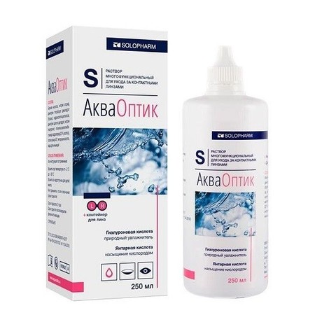 Раствор многофункциональный для ухода за контактными линзами АкваОптик представляет собой прозрачный или слегка опалесцирующий бесцветный раствор.