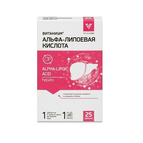 АЛЬФА-ЛИПОЕВАЯ КИСЛОТА ВИТАНИУМ - Биологически активная добавка (БАД) к пище Содержание биологически активного вещества в 2 таблетках (суточной дозировке): Липоевая кислота 60 мг 200 % от адекватного уровня потребления 1 1 - согласно «Единым санитарно-эпидемиологическим и гигиеническим требованиям к товарам, подлежащим санитарно-эпидемиологическому надзору (контролю)» (Приложение 5). - не превышает верхний допустимый уровень потребления согласно «Единым санитарно-эпидемиологическим и гигиеническим требованиям к товарам, подлежащим санитарно-эпидемиологическому надзору (контролю)». Информация о пищевой ценности продукта определена расчетным путем по среднему значению содержания биологически активного вещества (БАВ) в продукте. Пищевая ценность 1 таблетки: углеводы - 0,1 г. Энергетическая ценность 1 таблетки - 0,4 ккал/1,7 кДж. Альфа-липоевая кислота ВИТАНИУМ ® - один из самых эффективных природных антиоксидантов, работает не только вне, но и внутри клетки. Усиливает и продлевает действие собственных антиоксидантов организма (Q10, витаминов Е и С)/ отличается высокой дозировкой (200 % от уровня потребления в сутки), что помогает не только устранять его временный дефицит, но и правильно регулировать обменные процессы, активнее избавляться от лишнего веса.
