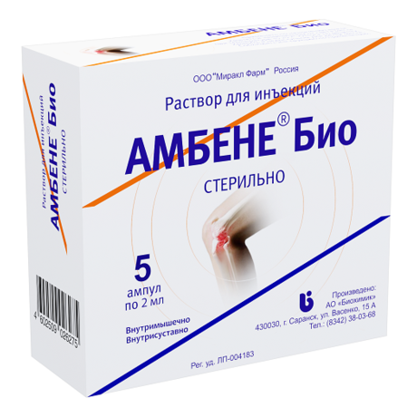 | Амбене® Био | Р-р д/инъекц. 0.1 г/1 мл: амп. 1 мл или 2 мл 5 или 10 шт. рег. №: ЛП-004183 от 15.03.17 *- Действующее* Дата перерегистрации: 10.03.22 |