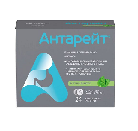 | Безрецептурный препарат | Антарейт® | Таблетки жевательные со вкусом карамели 800 мг: 8, 16, 24 или 48 шт. рег. №: ЛП-(003713)-(РГ-RU) от 17.11.23 *- Действующее* |