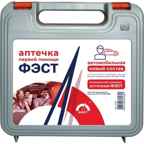 Аптечка для оказания первой помощи пострадавшим в дорожно-транспортных проишествиях (автомобильная) «ФЭСТ» по ТУ 9398-100-10973749-2020 Состав аптечки соответствует приказу Министерства здравоохранения Российской Федерации от 08.10.2020 № 1080н Добровольный сертификат POCC RU.32001.04.ИБФ1.ОСП09.07489 ТУ 9398-100-10973749-2020 Футляр полистирол 20520570 мм Цвет - серый