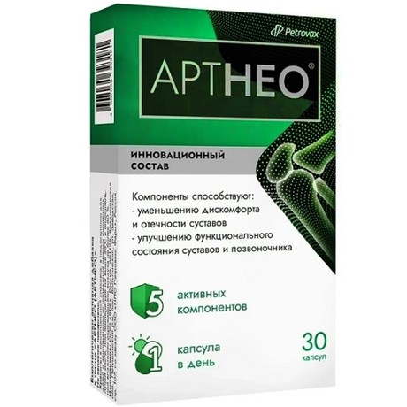 АРТНЕО® - это инновационный 5-ти компонентный состав** для здоровья суставов и позвоночника. Специально подобранные компоненты - неденатурированный коллаген II типа, МСМ, босвеллиевые кислоты, витамины С и D3 - обладают комплексным действием, способствуя уменьшению дискомфорта, отечности, болезненных ощущений, скованности, а также восстановлению и поддержанию функционального состояния суставов и позвоночника. 5 активных компонентов АРТНЕО® способствуют уменьшению болезненных ощущений и отечности, помогая организму восстанавливать функциональное состояние суставов и позвоночника.