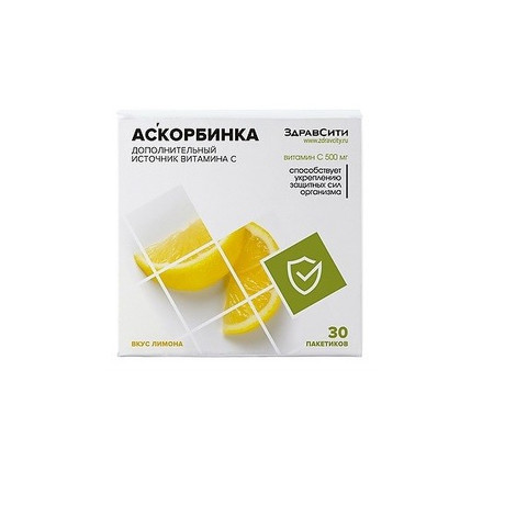 Аскорбинка – дополнительный источник витамина С. Способствует укреплению защитных сил организма. В одном пакетике содержится 500 мг витамина С, что соответствует 832% рекомендуемой нормы суточного потребления и не превышает верхний допустимый уровень.
