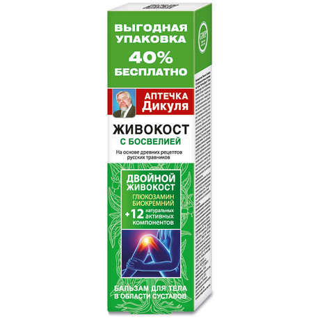 Бальзам для тела "Живокост. Босвелия. 12 натуральных активных компонентов серии "Аптечка Дикуля" - натуральное многокомпонентное средство для тела в области суставов и позвоночника. Действие бальзама направлено на активизацию кровообращения и нормализацию метаболизма в тканях, а также сохранение здорового функционального состояния, торможение деструктивных процессов. Окопник, уникальное по лечебному воздействию на кости и суставы. Это отражено и в его народных названиях: живокост, правокост; и в научном: Symphytum, от греческого Symphyo-сращивать, соединять. При суставных заболеваниях и травмах, в качестве заживляющего, противовоспалительного, анти ревматического средства окопнику нет равных. Его лечебные свойства высоко ценили врачи от Парацельса до Пирогова. Особенно прославился окопник своей способностью быстро заживлять раны и травмы, благодаря чему являлся первым средством помощи раненым в полевых условиях. Поразительный целебный эффект окопника связан с высоким содержанием аллантоина, который не только характеризуется мощным бактерицидным и противовоспалительным действием, но и обладает уникальной способностью стимулировать образование новых, здоровых клеток любой ткани. При суставных заболеваниях окопник снимает воспаление и отеки, а главное, активизирует процессы обновления и регенерации хряща. Босвелия (ладанное дерево) -обладает выраженными противовоспалительными, антисептическими свойствами. В древнем Китае, Египте, Индии по стоимости приравнивалась к драгоценным камням. Целители и официальная медицина используют её при ревматизме и других заболеваниях суставов. Активные компоненты босвелии тормозят воспалительные процессы в суставах, способствуют восстановлению поврежденных сосудов и улучшению питания суставов. Благодаря своим целебным свойствам, босвелия считается священным деревом и используется не только в медицине, но и при богослужениях. Золотой ус, входящий в состав бальзама - одно из самых эффективных средств народной медицины, завоевавшее в последние годы огромную популярность. Богатый биологически активными веществами, золотой ус является мощным биогенным стимулятором, который усиливает действие всех компонентов, входящих в состав композиции. Комплекс экстрактов лекарственных растений, составленный по принципу синергизма, обладает противовоспалительным действием, способствует выведению солей, снятию отека и мышечного спазма, активизирует кровообращение и улучшает трофику тканей. Хондроитин сульфат - важная составляющая часть хряща, эффективный хондропротектор. Активизирует процессы регенерации хряща, повышает содержание влаги в хрящевой ткани, предупреждая высыхание, сохраняя упругость и эластичность. Мумие - мощный биостимулятор, богатый активными веществами. Замедляет процесс старения сустава, ускоряет восстановление костей и суставов, способствует уменьшению ломоты, возникающей при переменах погоды.
