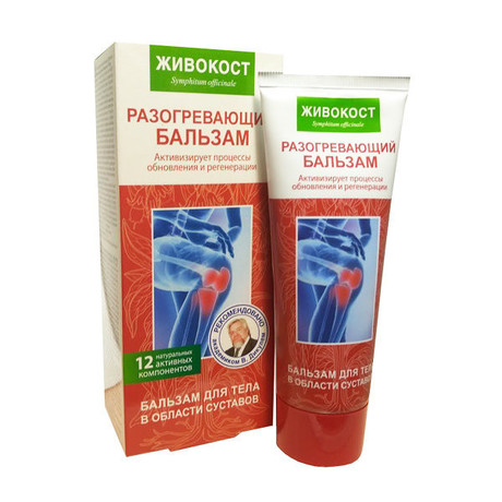 Бальзам для тела разогревающий "Живокост. 12 натуральных активных компонентов" серии" Аптечка Дикуля” - натуральное- натуральное многокомпонентное средство для тела в области суставов и позвоночника. Действие бальзама направлено на активизацию кровообращения и нормализацию метаболизма в тканях, а также сохранение здорового функционального состояния, торможение деструктивных процессов. Основу бальзама составляет знаменитое лекарственное растение Окопник, уникальное по лечебному воздействию на кости и суставы. Это отражено и в его народных названиях: живокост, правокост; и в научном: Symphytum, от греческого Symphyo-сращивать, соединять. При суставных заболеваниях и травмах, в качестве заживляющего, противовоспалительного, антиревматического средства окопнику нет равных. Его лечебные свойства высок оценили врачи от Парацельса до Пирогова. Документально засвидетельствовано успешное лечение окопником болезней суставов у Ивана Грозного и императрицы Екатерины II. Сегодня он широко применяется в медицине многих стран. Особенно прославился окопник своей способностью быстро заживлять раны и травмы, благодаря чему являлся первым средством помощи раненым в полевых условиях. Поразительный целебный эффект окопника связан с высоким содержанием аллантоина, который не только характеризуется мощным бактерицидным и противовоспалительным действием, но и обладает уникальной способностью стимулировать образование новых, здоровых клеток любой ткани. При суставных заболеваниях окопник снимает воспаление и отеки, а главное, активизирует процессы обновления и регенерации хряща. Золотой ус, входящий в состав бальзама - одно из самых эффективных средств народной медицины, завоевавшее в последние годы огромную популярность. Богатый биологически активными веществами, золотой ус является мощным биогенным стимулятором, который усиливает действие всех компонентов, входящих в состав композиции. Комплекс экстрактов лекарственных растений, составленный по принципу синергизма, обладает противовоспалительным действием, способствует выведению солей, снятию отека и мышечного спазма, активизирует кровообращение и улучшает трофику тканей. Мумие -мощный биостимулятор, богатый активными веществами. Замедляет процесс старения сустава, ускоряет восстановление костей и суставов, способствует уменьшению ломоты, возникающей при переменах погоды. Экстракты и масла лекарственных растений оказывают антиоксидантное, регенерирующее, иммунокорректирующее, противовоспалительное, бактериостатическое, болеутоляющее, спазмолитическое, противоотёчное действие. Улучшают питание суставов. Капсаицин (перец стручковый) обладает выраженным разогревающим и обезболивающем действием, расширяет сосуды и улучшает питание тканей, является трансдермальным проводником для активных компонентов бальзама, способствует выведению продуктов распада (шлаков, солей).Бальзамы больше напоминают мази: они плотные, вязкие, оставляют ощутимую жирную питательную пленку после обработки, которая долго не высыхает. В бальзаме нет воды, в отличии от крема и геля, поэтому он долгое время может сохранять полезные свойства. Средство без запаха, что позволяет его использовать в ночное и дневное время суток.Подходит как для мужчин, так и для женщин. Не имеет негативных побочн