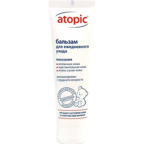 Специальные особенности: Не содержит парабены, отдушки и красители, гипоаллергенный. Возраст с рождения. Бальзам для ежедневного ухода atopic - это эмолент с плотной, насыщенной текстурой для ежедневного ухода за склонной к атопии, чувствительной и сухой кожей лица и тела ребенка, начиная с грудного возраста. Комплекс современных эмолентов, глицерина, масла Ши и витамина Е интенсивно смягчает и увлажняет кожу. Нормализует состояние эпидермального барьера, успокаивает кожу. Восстанавливает липидный слой эпидермиса, уменьшает реактивность кожи и защищает от внешних негативных факторов. Является обратной эмульсией. Бальзам дольше впитывается, имеет водостойкую структуру за счет того, что масло находится сверху. Обратная эмульсия образует защитную пленку на коже и не дает влаге возможности испариться. Бальзам atopic будет идеальным решением для тех, кто нуждается в более густых эмолентах. Бальзам с плотной текстурой входит в серию средств atopic для полноценного базового ухода за атопичной, чувствительной и сухой кожей ребенка начиная с грудного возраста. Улучшает состояние кожи и самочувствие при атопическом дерматите/экземе. Средства atopic обеспечивают ежедневный уход за сухой кожей лица и тела: бережное очищение, увлажнение и смягчение. * По объему аптечных продаж в натуральном и стоимостном выражении в категории косметических средств, применяемых при атопическом дерматите для детей, DSM Group, 2022 год