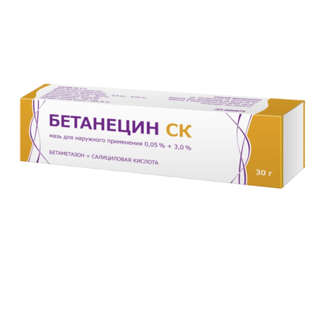 БЕТАНЕЦИН СК - комбинированный препарат, содержащий действующие вещества бетаметазона дипропионат и салициловую кислоту. Бетаметазона дипропионат - синтетический фторированный глюкокортикостероид (ГКС) - оказывает противовоспалительное, противозудное и сосудосуживающее действие. Салициловая кислота, обладая кератолитическим действием, способствует проникновению бетаметазона в кожу. Обладает бактериостатическим и некоторым фунгицидным действием. Сочетанное действие активных компонентов приводит к быстрому снижению выраженности таких симптомов как зуд, раздражение, эритема и боль.