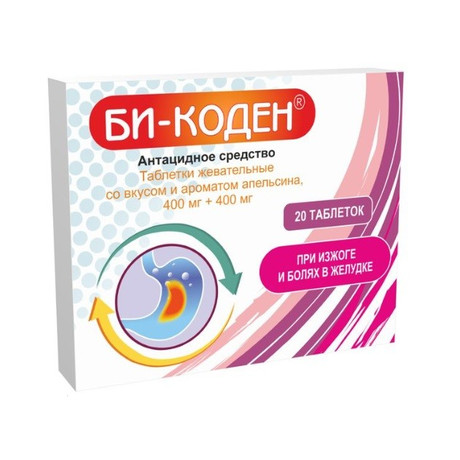 | Би-Коден® | Таб. жевательные, со вкусом колы, 400 мг+400 мг: 10, 20, 30, 40, 50, 60, 80, 100 или 120 шт. рег. №: ЛП-007062 от 02.06.21 *- Действующее* | |