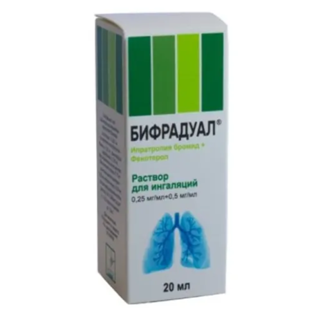 | Препарат отпускается по рецепту | Бифрадуал® | Раствор для ингаляций 0.5 мг+0.25 мг/мл: фл. 10 мл, 15 мл, 20 мл или 30 мл 1 шт. рег. №: ЛП-006138 от 12.03.20 *- Действующее* |