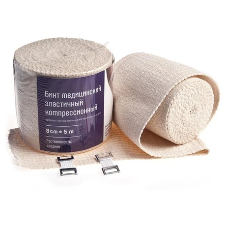 Хлопок 52%, полиэфир 33%, латекс 15%, в комплекте имеются соединительные крючки для закрепления повязки.