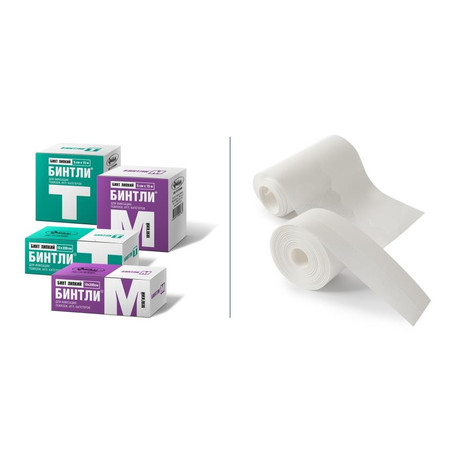 БИНТЛИ-М – очень мягкий липкий бинт повышенной драпируемости, идеален для фиксации повязок на локтевом, коленном суставах и т.п.