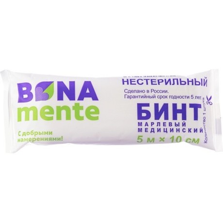 Бинт марлевый медицинский нестерильный 5 м х 10 см - предназначен для фиксации, наложения, изготовления операционно-перевязочных средств. Бинт белого цвета, без цветных и жирных пятен, с обрезанной кромкой, без швов.