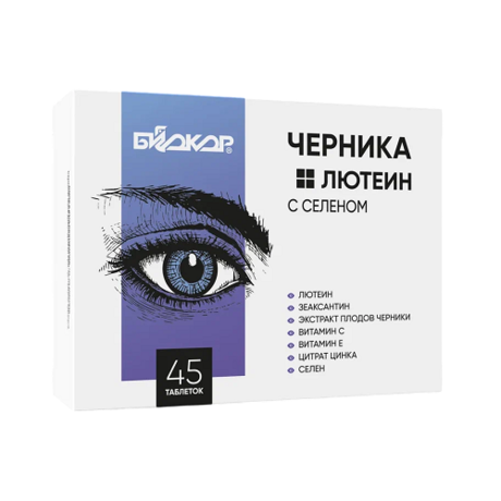 БАД «Черника + Лютеин с селеном Биокор» - комплекс для поддержания здоровья сетчатки и укрепления сосудов глаз. Комплекс совместил в себе все необходимые действующие вещества для защиты здоровья глаз. Употребление трех таблеток удовлетворяет: рекомендуемый уровень суточного потребления витамина С на 150%, витамина Е - на 150%, цинка - на 80%, селена - на 100%, адекватный уровень потребления антоцианов - на 20%, лютеина - на 150%, зеаксантина - на 225%, флавоноидов - на 100%. Пищевая ценность (средние значения) в 100 г: белки - 0 г, жиры - 0 г, углеводы - 75 г, витамин С - 7,5 г±20%, витамин Е - 1,25 г±30%, цинк - 1,0 г±20%, селен - 5,83 мг±20%, энергетическая ценность - 300 ккал (1275 кДж).