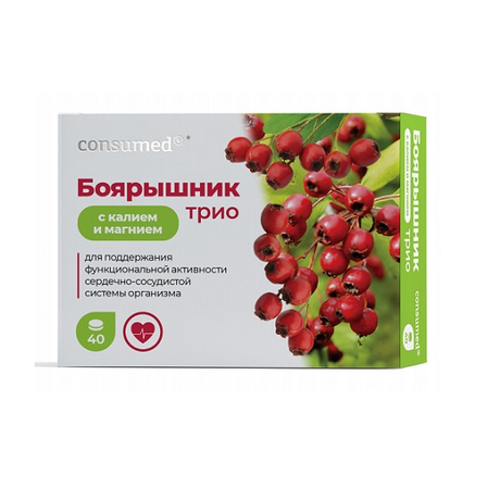 Сухой экстракт плодов боярышника 200 мг/табл., микрокристаллическая целлюлоза (наполнитель), калия цитрат 75 мг/табл., магния цитрат 75 мг/табл., лактоза моногидрат, агенты антислеживающие: кальция стеарат Е470, тальк Е553.