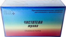 Средство растительного происхождения. Чистотела трава оказывает противовоспалительное, противомикробное, противогрибковое (фунгицидное и фунгистатическое), противотрихомонадное, дерматопротекторное, противотуберкулезное, иммунодепрессивное, цитостатическое, седативное, анальгезирующее, спазмолитическое, антихолинэстеразное, желчегонное, диуретическое, противосудорожное, гипотензивное и антигистаминное действие.