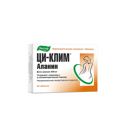 Ци-Клим Аланин – негормональное средство для борьбы с приливами. В его составе -аминокислота бета-аланин. Бета-аланин – витаминоподобное вещество (аминокислота), которое образуется в организме человека. Но с наступлением климакса у женщин его выработка значительно снижается. Поэтому для поддержания нормальной температуры кожи важно получать его извне. Бета-аланин способен предотвратить развитие приливов, а при длительном приеме уменьшает частоту их возникновения и интенсивность. Бета-аланин хорошо переносится, не ведет к увеличению массы тела. Таблетки круглые, двояковыпуклые, белого или почти белого цвета.