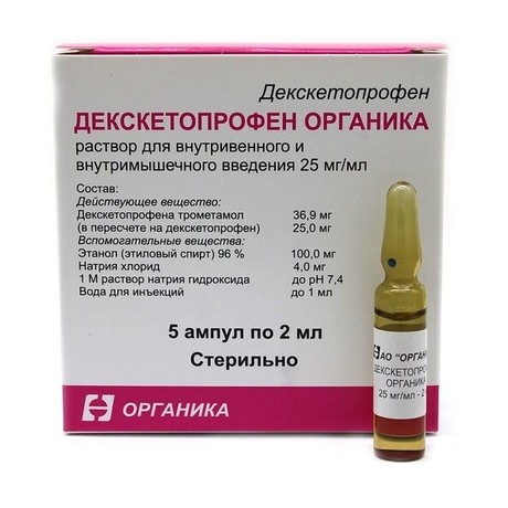 | Декскетопрофен Органика | Р-р д/в/в и в/м введения 25 мг/мл: амп. 2 мл 5 или 100 шт. рег. №: ЛП-006235 от 04.06.20 *- Действующее* |