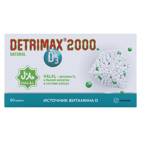ДЕТРИМАКС НЕЙЧРАЛ - Биологически активная добавка (БАД) к пище - жизненно важный жирорастворимый витамин, необходимый для обеспечения деятельности практически всех органов и систем человеческого организма. • Для производства капсул ДЕТРИМАКС® НЭЙЧРАЛ 2000 используется желатин, произведенный из бычьих шкур. • Бычий желатин в капсулах ДЕТРИМАКС® НЭЙЧРАЛ 2000 является продуктом HALAL в соответствии с исламскими правилами. • Витамин D3, используемый при производстве ДЕТРИМАКС® НЭЙЧРАЛ 2000, также соответствует требованиям HALAL.