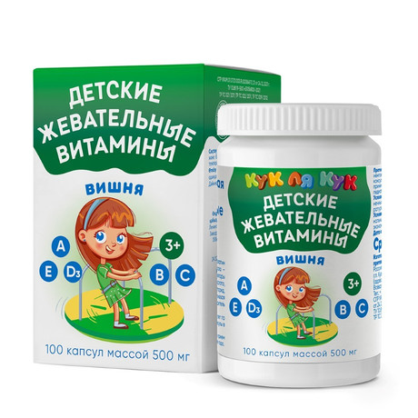 КУК ЛЯ КУК ВИТАМИН D3 ДЕТСКИЕ ЖЕВАТЕЛЬНЫЕ КАПСУЛЫ СО ВКУСОМ ВИШНИ - Биологически активная добавка к пище дополнительный источник витаминов А, В1, В2, В3, В6, В9, В12, С, D3, Е. Способствует укреплению иммунитета, повышает работоспособность при физических и умственных нагрузках, для профилактики гиповитаминозов и поддержки в период роста. Одна капсула содержит: Витамин А (РЭ) 0,125 мг Витамин Е (ТЭ) 1,75 мг Витамин ДЗ 2,5 мкг Витамин В1 0,225 мг Витамин В2 0,25 мг Витамин ВЗ 2,75 мг Витамин В6 0,3 мг Витамин В9 50 мкг Витамин В12 0,375 мкг Витамин С 12,5 мг