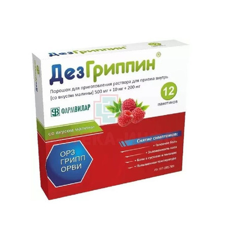 | ДезГриппин® | Порошок д/пригот. р-ра д/приема внутрь со вкусом малины 500 мг+10 мг+200 мг/5 г: пак. 3, 6, 12 или 24 шт. рег. №: ЛП-005789 от 11.09.19 *- Действующее* |