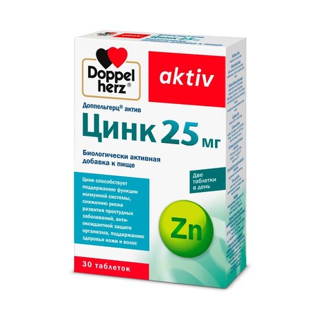 Вся продукция компании Квайссер Фарма ГмбХ и Ко.КГ производится на основе последних достиже-ний в технологии и соответствует высоким международным стандартам качества GMP. «Доппельгерц® актив Цинк 25 мг» способствует поддержанию функции иммунной системы, снижению риска развития простудных заболеваний, антиоксидантной защите организма, поддержанию здоровья кожи и волос. 2 таблетки содержат: Цинк 25 мг Описание активных компонентов: Цинк способствует повышению активности иммунных клеток и усилению производства антител в ответ на действие инфекций. Многие из важнейших белков, участвующих в противовирусной защите, содержат в своей структуре цинк. Особую важность имеет поддержание адекватного уровня цинка в организме для снижения риска респираторных вирусных инфекций. Цинк - это необходимый для жизни микроэлемент, который играет важную роль в качестве кофер-мента при образовании антиоксидантных ферментов, борющихся с окислительным стрессом. Цинк является одним из главных незаменимых микроэлементов, участвует в синтезе белка, в том чис-ле коллагена, ускоряет заживление ран. Способствует поддержанию здоровья кожи. В комплексной терапии диффузной алопеции цинк может способствовать уменьшению интенсивности выпадения во-лос, а также их утолщению и росту. Основной причиной дефицита цинка у человека является его сниженная биодоступность в результате мальнутриции (дефицита в питании) и/или мальабсорбции (нарушения всасываемости в кишечнике). Хелатная форма цинка - это легкодоступная форма цинка, представляющая собой соединение минера-ла и аминокислоты, что обеспечивает его лучшее усвоение по сравнению с ионной формой металла.