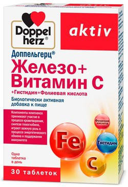 ДОППЕЛЬГЕРЦ АКТИВ ЖЕЛЕЗО+ВИТАМИН С+ГИСТИДИН+ФОЛИЕВАЯ КИСЛОТА - Биологически активная добавка (БАД) к пище - Компоненты комплекса принимают участие в процессе кроветворения, синтезе гемоглобина, отвечающего за транспорт кислорода в крови, а также играют важную роль в процессе энергетического обмена и поддержании иммунитета. 1 таблетка содержит: Количество / % от рекомендуемого уровня суточного потребления Железо 10 мг 71 Витамин С 200 мг 333 Фолиевая кислота 300 мг 150 Витамин В12 3 мкг 300* L-гистидин 100 мг 5* не превышает верхний допустимый уровень потребления. ** адекватный уровень потребления Пищевая и энергетическая ценность: 1 таблетка содержит 9 кДж/ 2ккал, жиры 0 г, белки 0,1 г, углеводы 0,2 г. «Железо+Витамин С+Гистидин+Фолиевая кислота» товарного знака «Доппельгерц®» - комплекс, содержащий в составе биологически активные вещества для поддержки нормального кроветворения в организме (образования красных кровяных телец крови), а также оптимальной работы иммунной системы человека. Железо - минеральное вещество, способствует поддержанию нормального уровня красных кровяных телец (эритроцитов) и поддержанию энергетического обмена, а именно: - поддерживает стабильный энергетический метаболизм; - способствует нормальному транспорту кислорода в организме; - способствует образованию гемоглобина; - принимает участие в функции деления клеток; - поддерживает оптимальное функционирование иммунной системы. Гистидин -аминокислота, образует с железом хелатные комплексы, способствует образованию гемоглобина в крови, обладает антиоксидантным эффектом (способствует снижению влияния синглетного кислорода). Витамин С - поддерживает нормальное функционирование иммунной системы в организме; - помогает защитить клетки от окислительного стресса, обладает антиоксидантными свойствами; - увеличивает всасывание железа в организме. Фолиевое кислота - поддерживает процесс нормального образования крови; - способствует метаболизму гомоцистеина; - играет роль в нормальном функционировании иммунной системы и принимает участие в функции деления клеток. Витамин B12 - способствует нормальному энергетическому метаболизму; - поддерживает нормальное образование эритроцитов; - способствует поддержанию функционирования иммунной системы; - принимает участие в функции деления клеток.