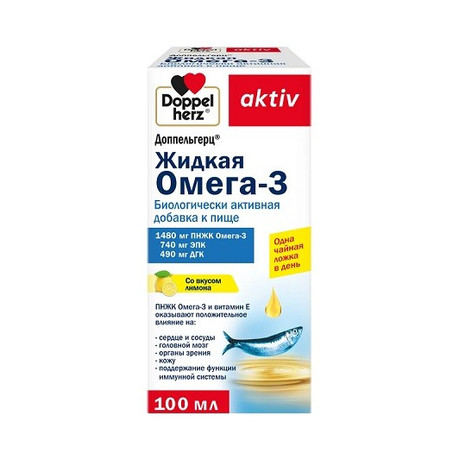 Вся продукция компании Квайссер Фарма ГмбХ и Ко.КГ производится на основе последних достижений в технологии и соответствует высоким международным стандартам качества GMP. «Жидкая Омега-3» товарного знака «Доппельгерц®» содержит ПНЖК Омега-3 и витамин Е оказывают, оказывает положительное влияние на: - сердце и сосуды - головной мозг - органы зрения - кожу - поддержание функции иммунной системы Кол-во в 5 мл (1 чайная ложка) ПНЖК Омега-3 - 1480 мг, в том числе: - эйкозапентаеновая кислота 740 мг* - Витамин Е 4 мг Пищевая и энергетическая ценность: 5 мл (1 чайная ложка) содержит 170 кДж/ 41 ккал, жиры 4,6 г, белки 0 г, углеводы 0 г. Указания для больных сахарным диабетом: не содержит хлебных единиц.