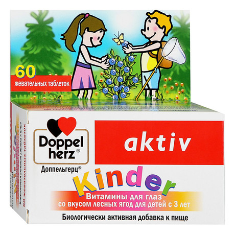 ДОППЕЛЬГЕРЦ KINDER ВИТАМИНЫ ДЛЯ ГЛАЗ СО ВКУСОМ ЛЕСНЫХ ЯГОД ДЛЯ ДЕТЕЙ С 3 ЛЕТ - специально разработанный витаминно-минеральный комплекс с лютеином, бета-каротином и витаминами, компоненты которого способствуют улучшению питания тканей детского глаза от 3-х лет. Может применяться при длительных нагрузках на зрение (компьютерные игры, просмотр телевизора, чтение и др.)