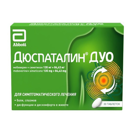 Препарат Дюспаталин® Дуо, комбинированный препарат, содержащий два активных компонента: мебеверин – миотропный спазмолитический препарат, и симетикон – ветрогонное средство. Действие препарата Дюспаталин® Дуо обусловлено входящими в его состав компонентами.
