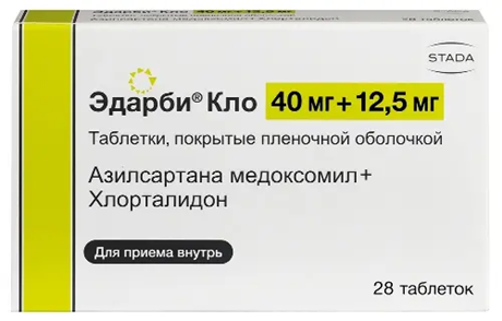 Комбинированный антигипертензивный препарат. В состав препарата Эдарби® Кло входят антагонист рецепторов ангиотензина II (азилсартана медоксомил) и тиазидоподобный диуретик (хлорталидон). Одновременное применение двух действующих веществ приводит к более выраженному снижению АД по сравнению с приемом каждого из них в монотерапии. При приеме препарата 1 раз/сут достигается эффективное снижение АД в течение 24 ч.