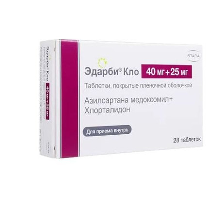 Комбинированный антигипертензивный препарат. В состав препарата Эдарби® Кло входят антагонист рецепторов ангиотензина II (азилсартана медоксомил) и тиазидоподобный диуретик (хлорталидон). Одновременное применение двух действующих веществ приводит к более выраженному снижению АД по сравнению с приемом каждого из них в монотерапии. При приеме препарата 1 раз/сут достигается эффективное снижение АД в течение 24 ч.