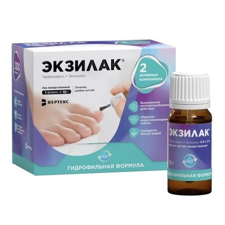 | Экзилак® | Лак д/ногтей лекарственный 4%+3%: фл. 10 г 1 или 2 шт. рег. №: ЛП-(002486)-(РГ-RU) от 07.06.23 *- Действующее* Предыдущий рег. №: ЛП-007297 |