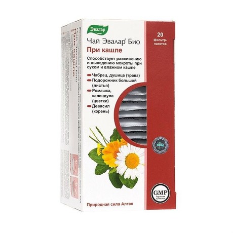 Чай Эвалар Био при кашле - способствует разжижению и выведению мокроты при сухом и влажном кашле, очищает бронхи, смягчает приступы сухого кашля, облегчает дыхание.