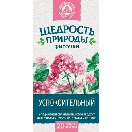 ЩЕДРОСТЬ ПРИРОДЫ ФИТОЧАЙ УСПОКОИТЕЛЬНЫЙ - специализированный пищевой продукт диетического профилактического питания Фиточаи линейки Щедрость природы от эксперта лекарственных трав и сборов - завода АО "Красногорсклексредства" выпускаются в условиях фармацевтического производства. Щедрость Природы - это сочетание приятного вкуса лекарственных трав, нежного пряного аромата и оздоровительного воздействия на организм. Действия фиточая обусловлено входящими в состав активными ингредиентами. • Рекомендован при нервной возбудимости, бессоннице • Облегчает засыпание
