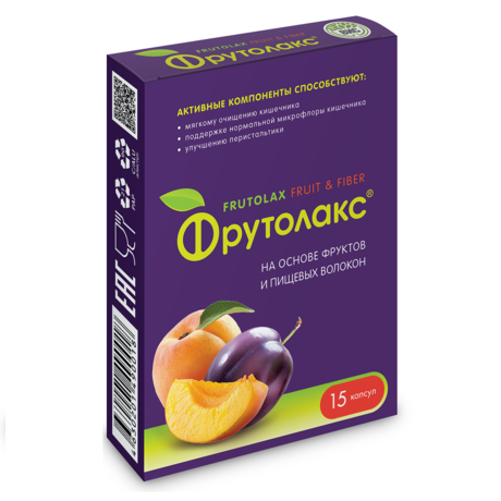 ФРУТОЛАКС НА ОСНОВЕ ФРУКТОВ И ПИЩЕВЫХ ВОЛОКОН - Биологически активная добавка (БАД) к пище Внешний вид и свойства: Капсулы твердые желатиновые или гидроксипропилметилцеллюлозные разъёмные с порошком. Допускается наличие комочков, рассыпающихся при лёгком механическом воздействии. Цвет от желто-коричневого до красно-коричневого различной интенсивности, допускается наличие белых вкраплений. Вкус специфический. Запах свойственный сырьевым компонентам. Периодические запоры - это распространенное и кратковременное нарушение режима работы кишечника, которое приводит к редким, нерегулярным или затрудненным дефекациям. Запоры, могут стать предвестником геморроя, ожирения и бессонницы. Здоровые привычки, которые способствуют предотвращению случайных запоров: - Здоровое питание, больше клетчатки в рационе (фрукты, овощи, отруби); - Регулярные физические нагрузки; - Достаточный питьевой режим; - При позыве к дефекации, не откладывать поход в туалет. "ФРУТОЛАКС" на основе фруктов и пищевых волокон способствует регулярности дефекации и формированию стула нормальной консистенции. Благодаря комбинации активных веществ 4 растительных компонентов, "ФРУТОЛАКС" способствует усилению перистальтики, улучшению эвакуаторной функции кишечника, обладает очищающими и сорбционным свойствами. Капсула содержит 99% компонентов растительного происхождения (на основе фруктов абрикоса, сливы, ревеня и свеклы). Не содержит сенны (бережное действие) Мягкое действие в ночное время, действие наступает через 8-10 часов после приёма.