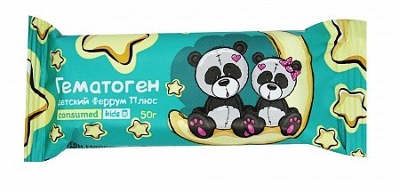 Consumed Kids Гематоген детский Fe+, с повышенным содержанием железа, 50 г является дополнительным источником железа, меди, йода и витаминов В6,В9, С.