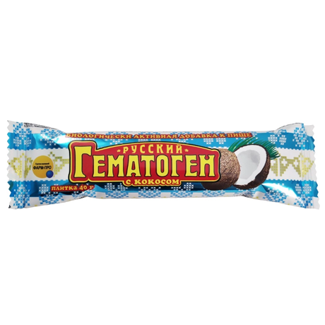 Гематоген - это приятное вкусное лакомство, сделанное на основе альбумина. Этот продукт является оригинальным источником железа. Гематоген русский с кокосом - это новая версия этого лакомства, которая предлагает потребителям нежный вкус кокоса в сочетании с богатстым составом. Каждая плитка гематогена содержит 40 грамм этого продукта и может использоваться в качестве дополнения к питанию или в качестве лакомства.