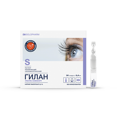 Гилан Ультра Комфорт – местный офтальмологический препарат, который воспроизводит действие слезной жидкости, увлажняет и защищает поверхность глаза, смазывает ее. Оказывает долговременное действие, облегчая проявления сухости глаз, которая обусловлена нарушением слезной пленки, секреции слезы, воздействием окружающих факторов (климатические установки, центральное отопление, флуоресцентные лампы, холод, ветер, пыль, дым), длительной работой за компьютером, применением противовоспалительных или сосудосуживающих капель для глаз, а также возрастными изменениями.