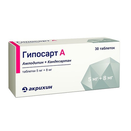 Доза 5 мг амлодипина и 8 мг кандесартана цилексетила 1 раз/сут назначается в виде 1 таблетки Гипосарт А 5 мг+8 мг.