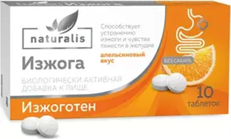 Жевательные таблетки НАТУРАЛИС ИЗЖОГА ИЗЖОГОТЕН способствуют облегчению жжения и дискомфорта в области желудка (изжоги) с приятным вкусом апельсина или мяты. Таблетки удобны в применении, достаточно разжевать или рассосать, не требует запивания водой. При необходимости можно повторить прием через 2 часа. НАТУРАЛИС ИЗЖОГА ИЗЖОГОТЕН не содержит сахара и может применяться вне зависимости от приема пищи.