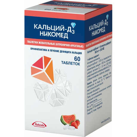 | Кальций-Д3 Никомед | Таб. жевательные (клубнично-арбузные) 500 мг+200 МЕ: 30, 60, 90 или 120 шт. рег. №: П N013478/01 от 16.09.11 *- Бессрочно* Дата перерегистрации: 03.09.21 | |