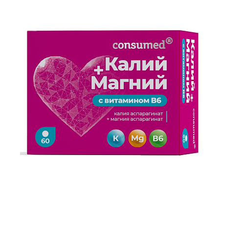 Калий Магний В6 — это необходимый комплекс для здоровья сердца и нервной системы. Сбалансированное сочетание калия, магния, аспарагиновой кислоты и витамина В6 обеспечивает много направленное действие на организм, помогая поддерживать нормальный сердечный ритм и уровень артериального давления. Магний способствует расслаблению сосудов и защите нервной системы от стрессов, помогая справиться с тревожностью и раздражительностью. Этот продукт - ваш надежный помощник в поддержании здоровья и благополучия. Калий Магний В6 — это универсальный продукт, подходящий как для женщин, так и для мужчин. Благодаря содержанию магнезиума magnesium в хелатной форме, он обеспечивает максимальную биодоступность и эффективность действия. Магний в хелате легко усваивается организмом, способствуя нормализации работы сердечно-сосудистой и нервной системы. Этот продукт станет незаменимым помощником для тех, кто заботится о своем здоровье и стремится поддерживать его на высоком уровне. Магний в таблетках — это удобный и эффективный способ пополнить запасы этого важного минерала в организме. Комплекс "магний b6" и калий обеспечивают необходимую поддержку для нервной системы и сердца. "Магний б6 для мужчин" и "магний б6 для женщин" с Калий помогают поддерживать здоровье и энергию на протяжении всего дня. "Магний в6 таблетки" с Калий — это удобный формат приема, который легко вписывается в любой режим дня. Витамины для женщин с Магний и Калий — это специально разработанный комплекс, учитывающий особенности женского организма, это проверенное сочетание, которое обеспечивает максимальную эффективность и безопасность приема. Снижение уровня магния в крови приводит к изменению сердечного ритма и тонуса сосудов, что, в свою очередь, может привести к повышению артериального давления. Магний способствует расслаблению сосудов и, соответственно, снижению давления. Магний помогает действовать аспирину, препятствующему образованию тромбов, также этот макроэлемент помогает повысить концентрацию внимания, улучшить качество сна. Аспарагиновая кислота является аминокислотой, входящей в состав белков. В свободном виде она: участвует в производстве пиримидиновых оснований; структурных элементов ДНК (дезоксирибонуклеиновая кислота) и РНК (рибонуклеиновая кислота), благодаря метаболическим процессам которых синтезируются белки для роста и жизнедеятельности клеток сердечной (кардиомиоцитов) и нервной тканей (нейронов); участвует в производстве главного источника энергии для кардиомиоцитов и нейронов -аденозинтрифосфорной кислоты (АТФ), обеспечивая слаженную работу сердца; отвечает за внутриклеточное накопление калия и магния; оказывает защитное действие на центральную нервную систему, способствуя уменьшению количества токсичного аммиака/ Являясь переносчиком ионов калия и магния через клеточные мембраны, аспарагиновая кислота обеспечивает их более высокую биодоступность. Витамин В6 (пиридоксин) способствует более полному усвоению и удерживанию магния в клетке, нормализации работы нервной системы. Он участвует в метаболизме белков нервной ткани, обладает антиоксидантным действием.