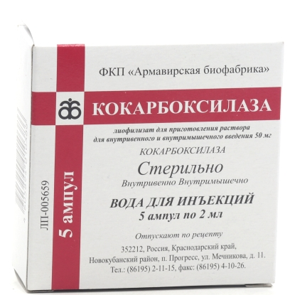 | Кокарбоксилаза | Лиофилизат д/пригот. р-ра д/в/в и в/м введения 50 мг: амп. 5 шт. в компл. с растворителем рег. №: ЛС-001545 от 19.10.11 *- Бессрочно* Дата перерегистрации: 09.06.18 |