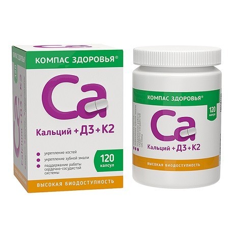 КОМПАС ЗДОРОВЬЯ КАЛЬЦИЙ+Д3+К2 - Биологически активная добавка (БАД) к пище - Капсулы «Кальций + Д3 + К2» представлены в органической хелатной форме, которая легко усваивается организмом и обладает минимальным риском развития побочных эффектов со стороны желудочно-кишечного тракта. Рекомендуемый прием (4 капсулы) содержит: Элементарный кальций - 266,7 мг/ 27% Витамин D3 - 10 мкг (400 МЕ) / 200 % Витамин К2 - 40 мкг / 33 % % Процент от рекомендуемой среднесуточной потребности согласно ТР ТС 022/2011 Пищевая ценность в 4-х капсулах Белки - 0,24 г Жиры - 0 г Углеводы - 0 г Энергетическая ценность: 4,25 кДж/1 ккал Один из важнейших минералов для человека – кальций. Дефицит кальция влечет за собой целый букет проблем: помимо хрупких костей и зубов, остеопороза и рахита, «рассыпаются» все системы организма. Высокая утомляемость, частые перепады настроения и стресс, постоянно пониженное давление, сердечно -сосудистые заболевания, спазмы, судороги и онемения, потеря упругости кожи свидетельствую о недостатке минерала. 98% запасов кальция содержится в костях, зубах и клетках организма. Но вследствие травм, переломов, стресса, перехода на строгую диету, недостатка витаминов А, С, D3, Mg и животного белка по разным причинам, уровень кальция снижается. Если не восполнять дефицит минерала извне, организм компенсирует потерю кальция из собственных запасов. Это влечет за собой его недостаток и развитие остеопороза, заболевания костей, страдает зубная эмаль. Капсулы содержат эффективную формулу «Ca + D3 + K2», где:-Ca Кальций в биодоступной хелатной форме готов к усвоению организмом. -D3 Витамин Д3 помогает кальцию лучше усвоиться в желудочно-кишечном тракте и попасть в кровоток. -К2 Витамин К2 обеспечивает поступление кальция в кости и зубы. Все компоненты подобраны так, чтобы обеспечить максимальное усвоение кальция организмом и принести максимальную пользу. Капсулы «Кальций + Д3 + К2» представлены в органической хелатной форме, которая легко усваивается организмом и обладает минимальным риском развития побочных эффектов со стороны желудочно-кишечного тракта. Кальций в хелатной форме – важный строительный материал костной системы человека. После принятия кальция заметен эффект: