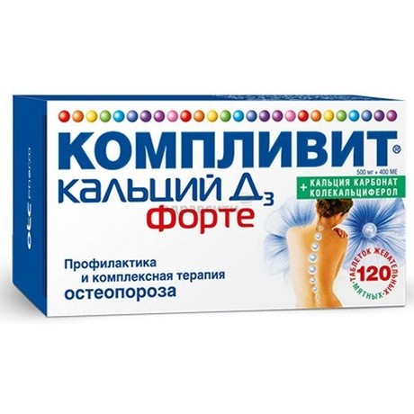 | Компливит® Кальций Д3 Форте | Таб. жевательные (мятные) 1.25 г+0.01 мг (400 МЕ): 30, 60, 90, 100 или 120 шт. рег. №: ЛСР-008769/09 от 02.11.09 *- Бессрочно* Дата перерегистрации: 21.05.15 |